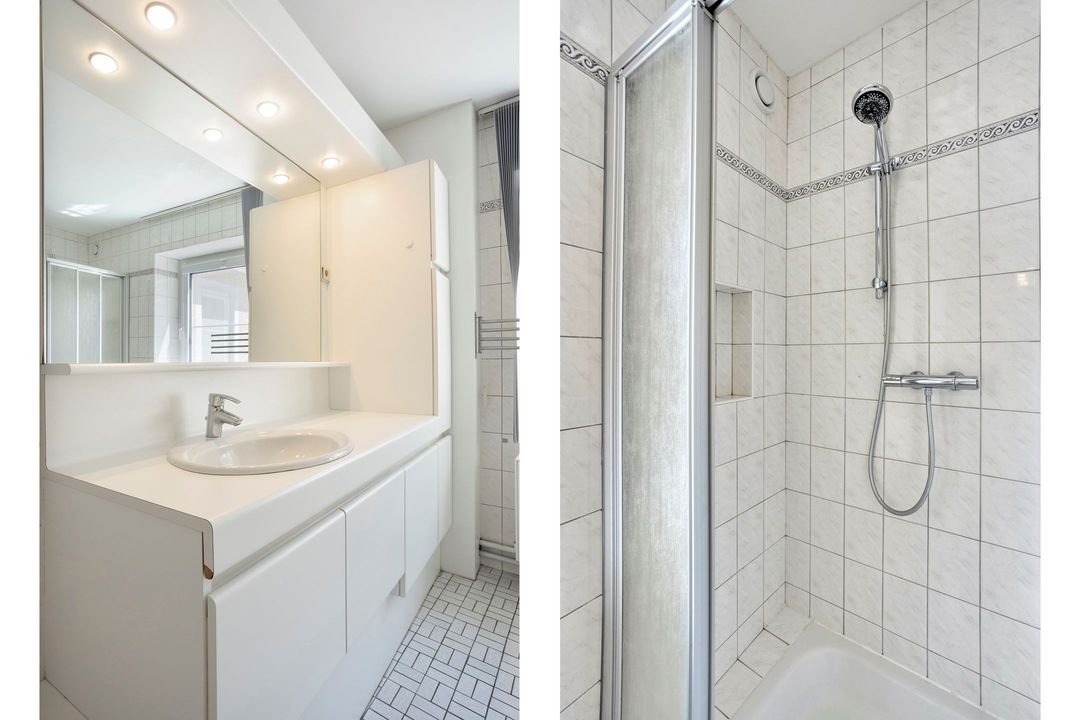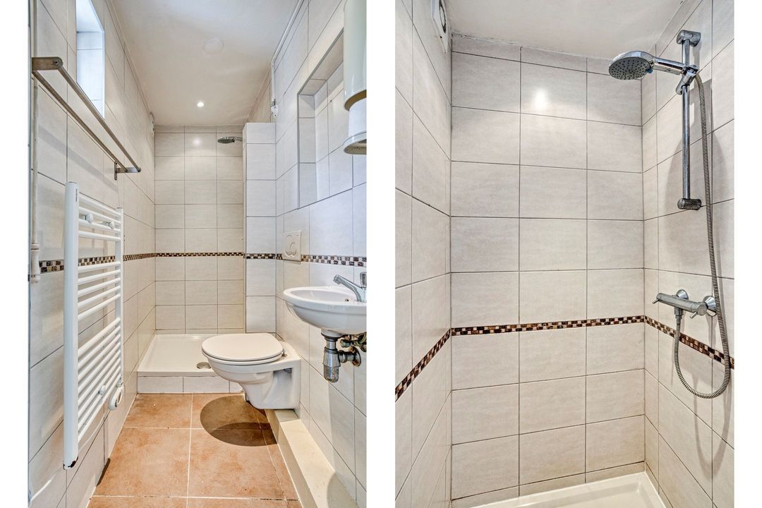 • Badkamer: De goed onderhouden, betegelde badkamer is ca. 2 m² groot en voorzien van een douchecabine, een hangcloset en een wastafel.