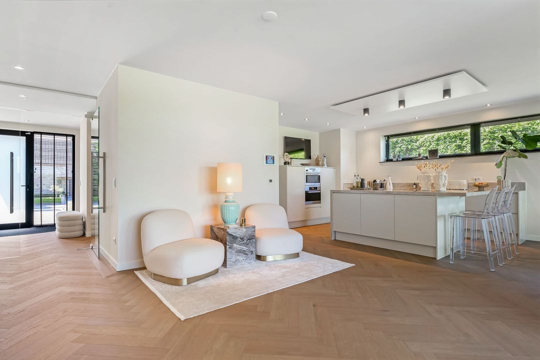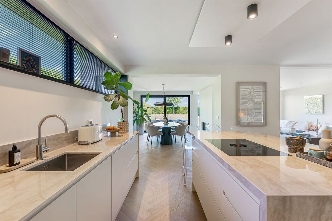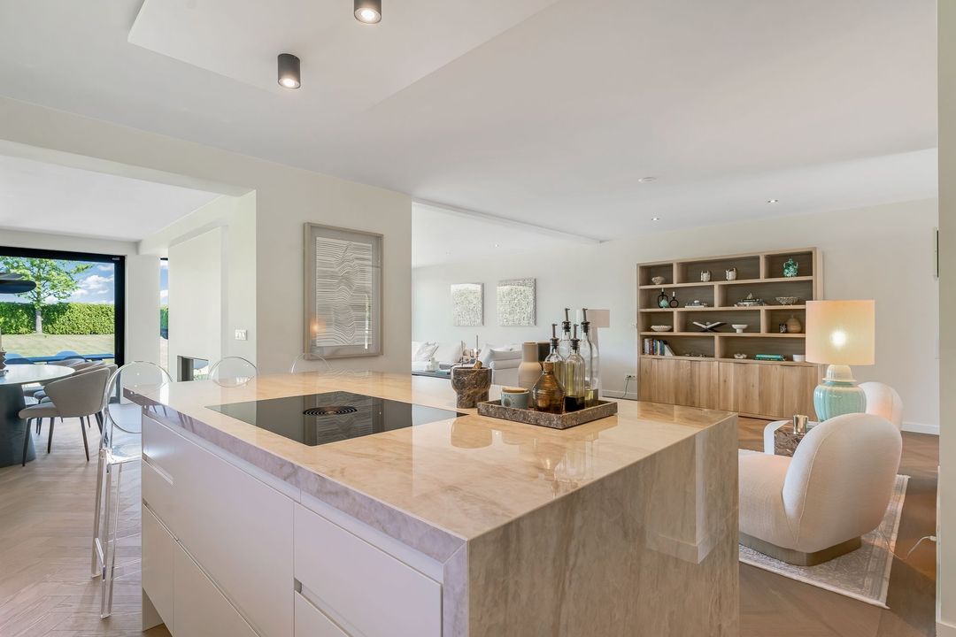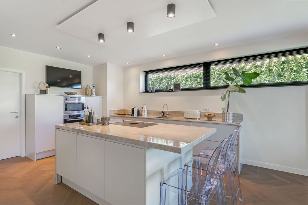 De woonkamer kenmerkt zich door een overvloed aan lichtinval dankzij de grote, tuingerichte raampartijen van het merk Schüco. Deze zorgen voor een prachtig binnen-buiten gevoel en een directe verbinding met de achtertuin. De open keuken is uitgevoerd met een centraal kookeiland en afgewerkt in hoogwaardig Dekton. Daarnaast is deze luxe keuken uitgerust met kwalitatieve inbouwapparatuur, waaronder een BORA inductiekookplaat met geïntegreerde afzuiging, combi-oven, stoomoven, vaatwasser en een inbouwkoelkast.