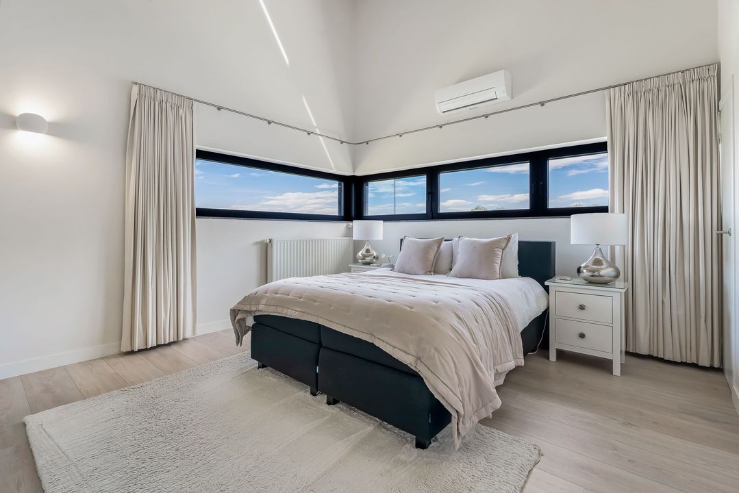 • Slaapkamer 1 – Master bedroom: Een royale en lichte kamer van ca. 21 m² met een prachtig uitzicht over de landelijke omgeving. Dankzij het hoge plafond tot in de nok van het dak voelt deze ruimte extra ruimtelijk en open aan.