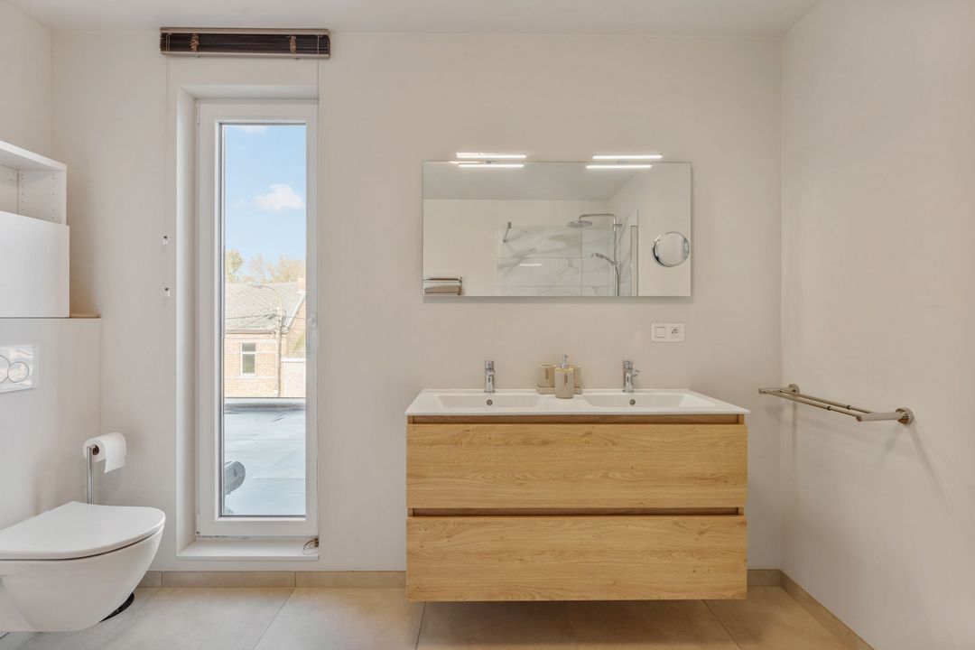 De hedendaagse badkamer (ca. 9 m²) is uitgerust met een inloopdouche, toilet en een wandmeubel met lavabo.