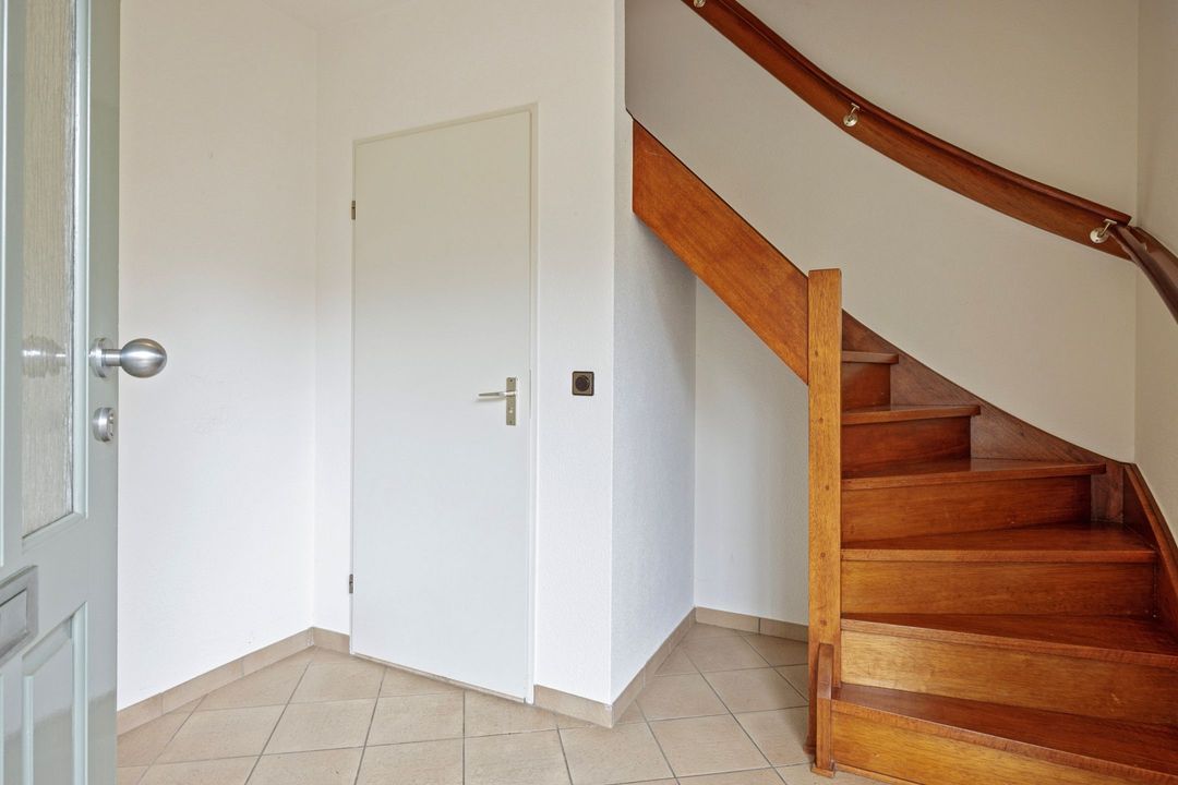 Via de trap in de entree bereikt u de eerste verdieping. De overloop biedt toegang tot drie slaapkamers en de badkamer.
