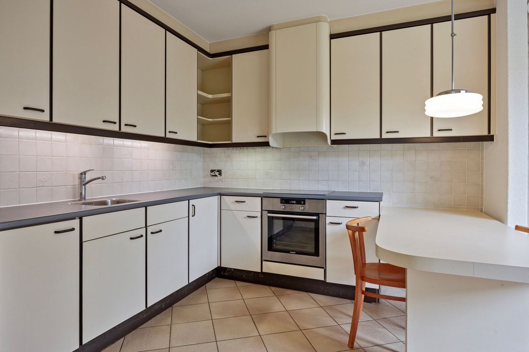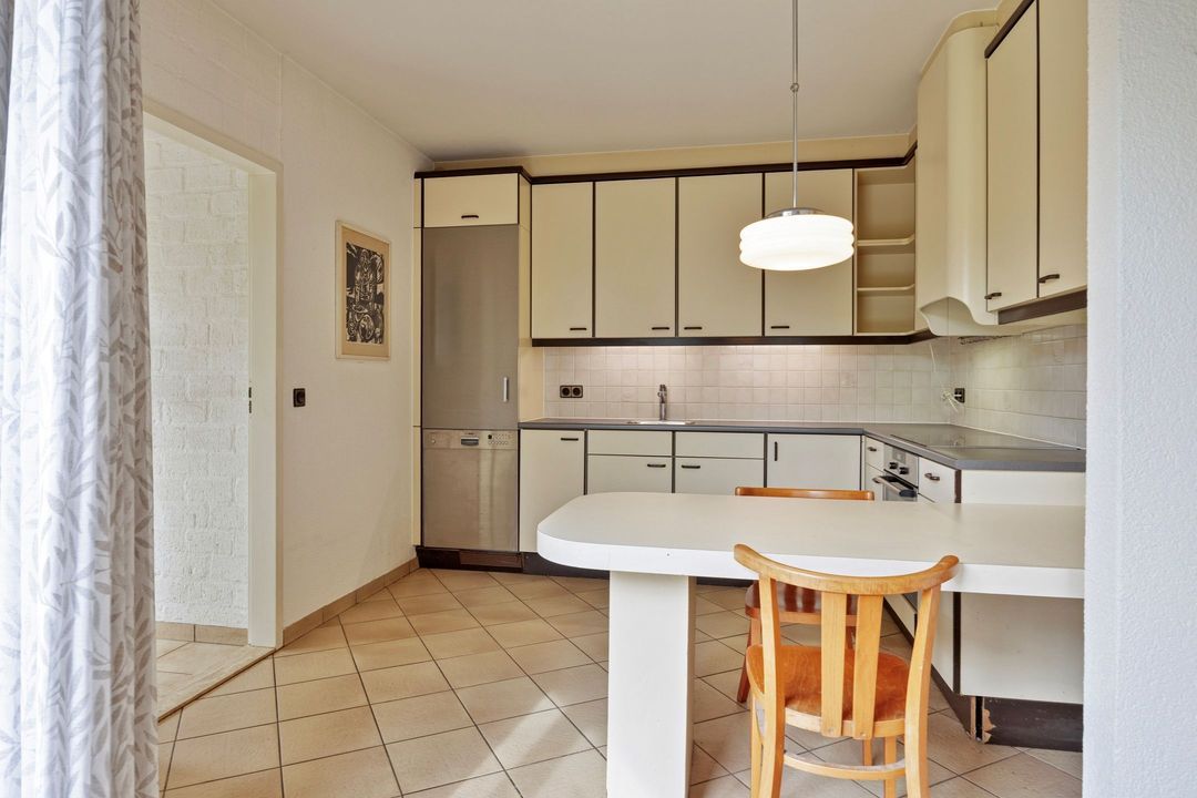 De nette keuken is gelegen aan de achterzijde van de woning en opgesteld in een praktische L-vorm. De keuken is voorzien van een elektrische kookplaat, afzuigkap en koelkast en staat in directe verbinding met de bijkeuken.