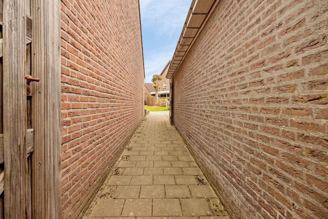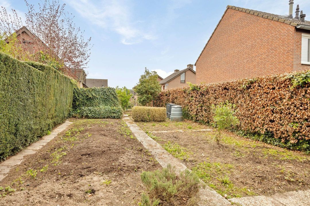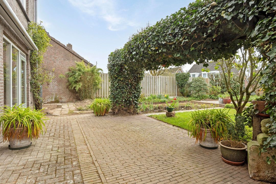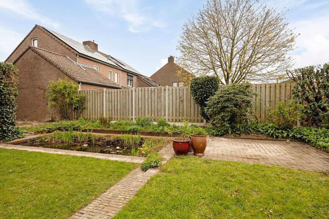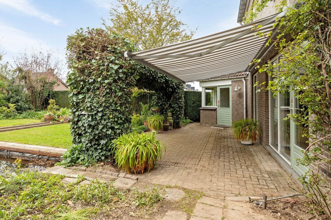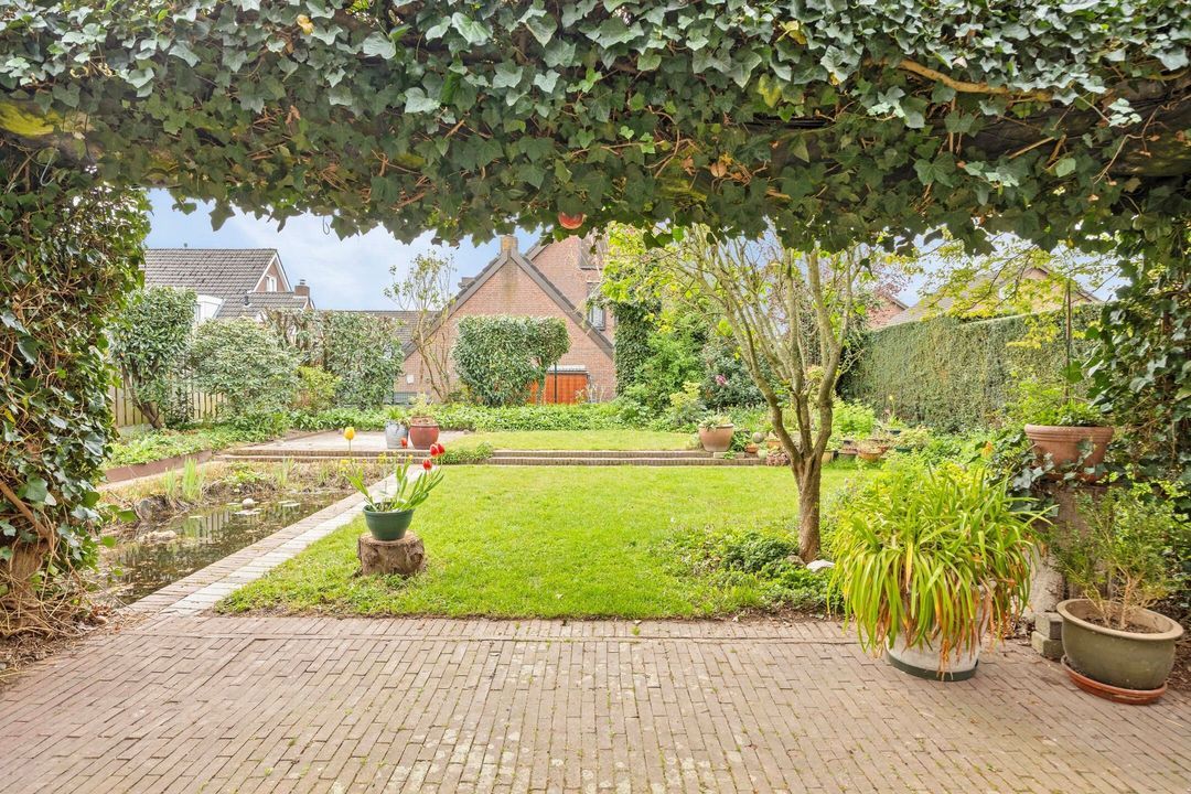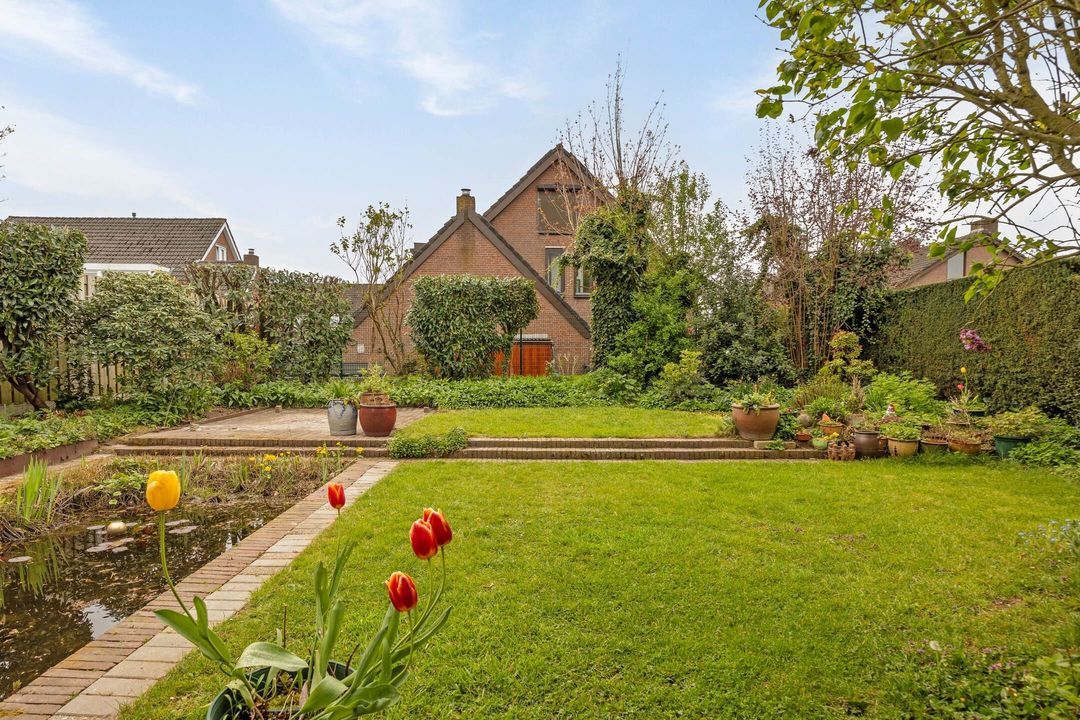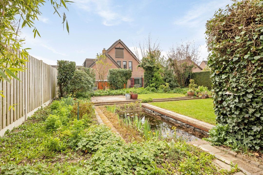 De royale en groene achtertuin is bereikbaar via de woonkamer, de bijkeuken, de garage en een praktische zijingang via een steegje. De tuin is fraai aangelegd met meerdere terrassen, een ruim gazon, een vijver en diverse beplanting, waardoor er een fijne balans ontstaat tussen rust en gebruiksgemak.