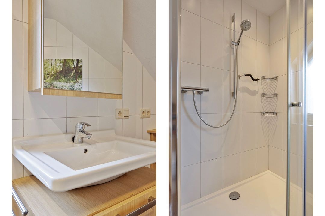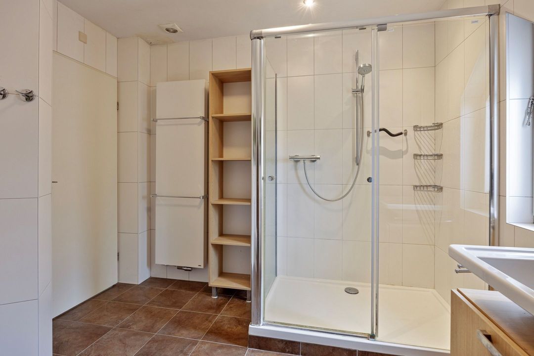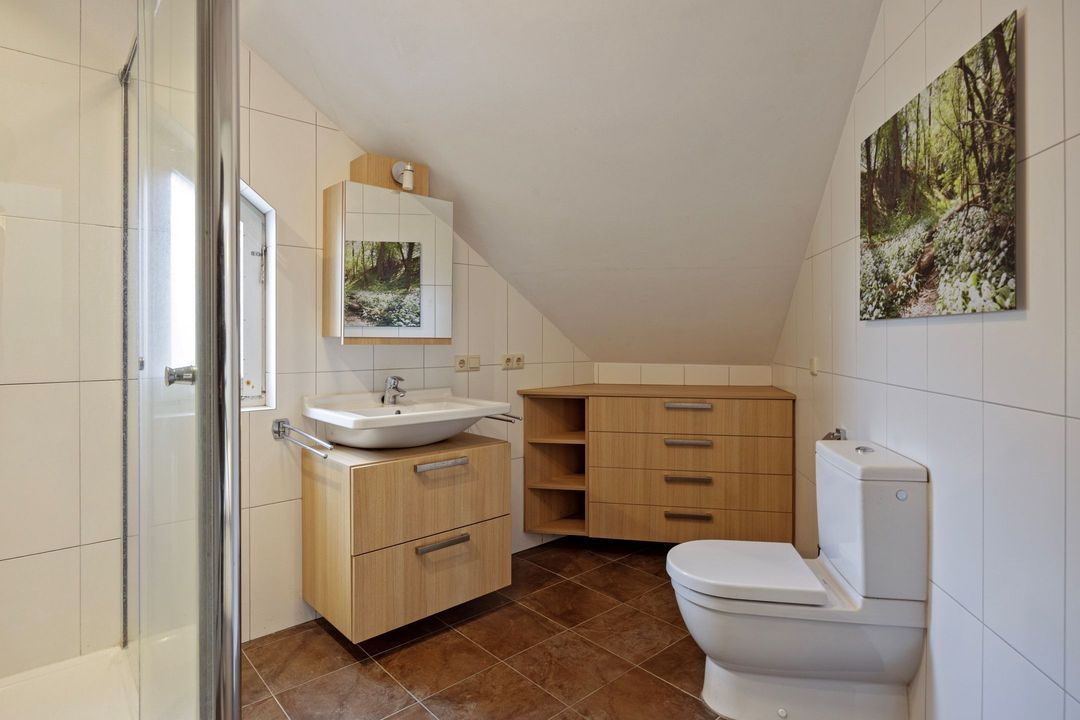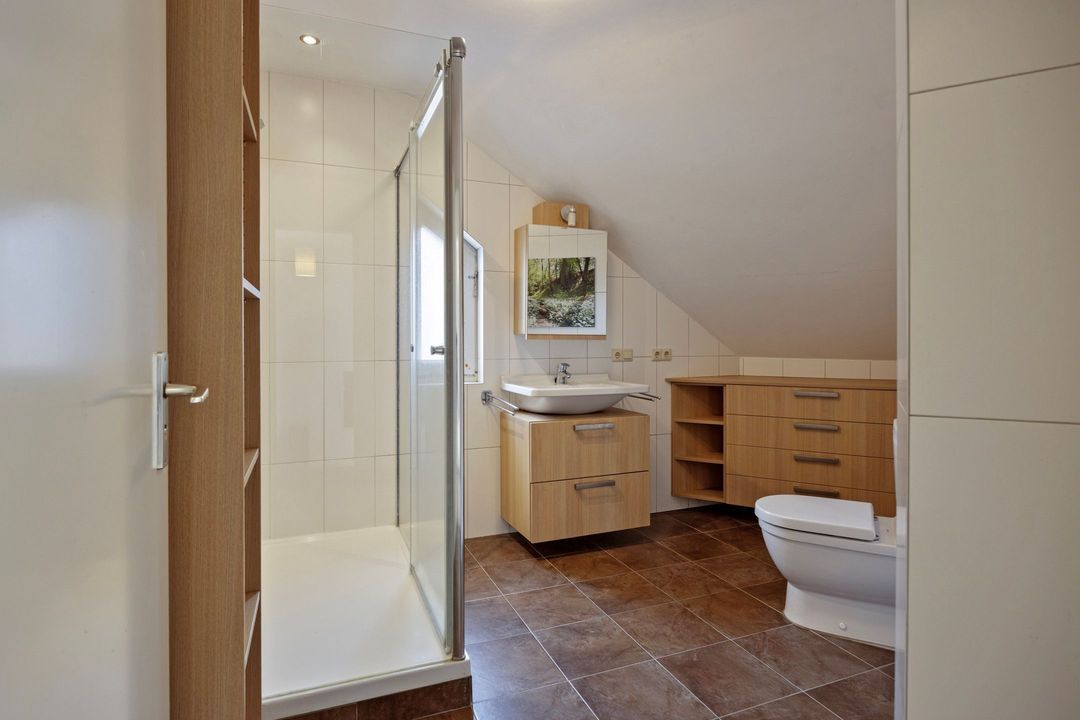 • Badkamer: De nette, betegelde badkamer (ca. 8 m²) is voorzien van een douchecabine, een wastafelmeubel en een staand closet.