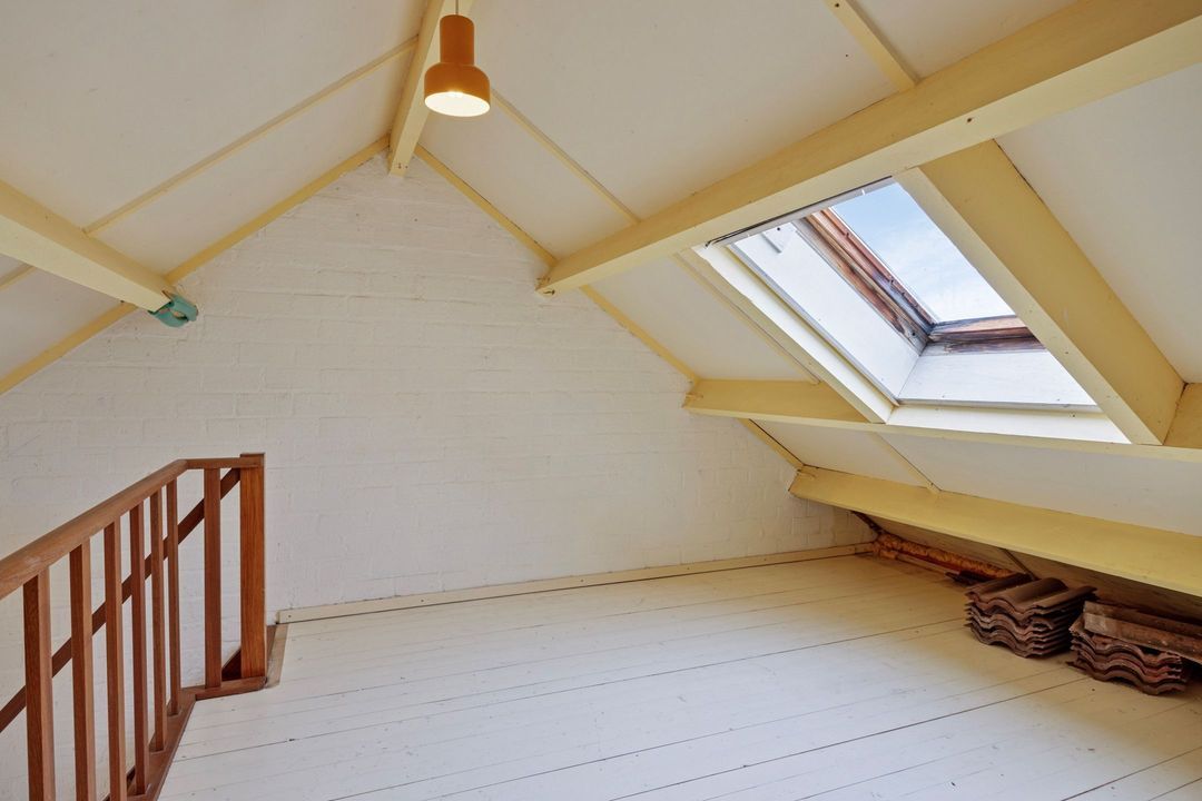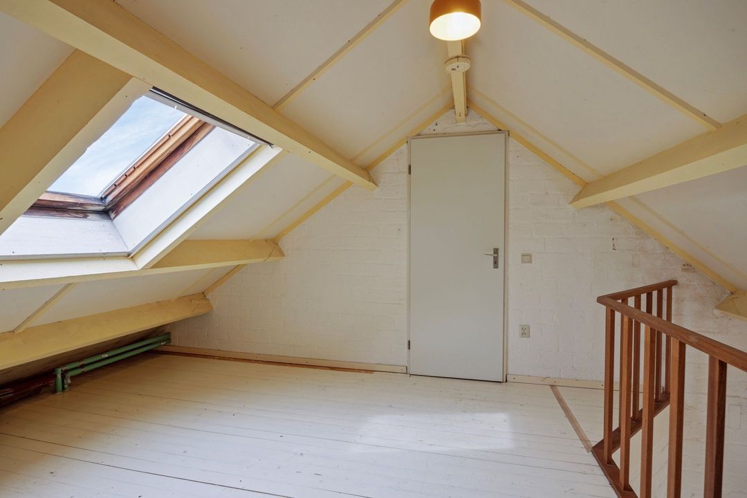 Via de vaste trap vanuit de eerste slaapkamer bereikt u de vliering, die desgewenst bij de slaapkamer kan worden betrokken. Aansluitend bevindt zich een ruime bergzolder met een vloeroppervlakte van circa 24 m². Hier is tevens de cv-installatie (Remeha, bouwjaar onbekend) gesitueerd. Met enkele aanpassingen, zoals het plaatsen van een dakkapel en het verplaatsen van de vaste trap, bestaat de mogelijkheid om hier een volwaardige en royale vierde slaapkamer te realiseren.