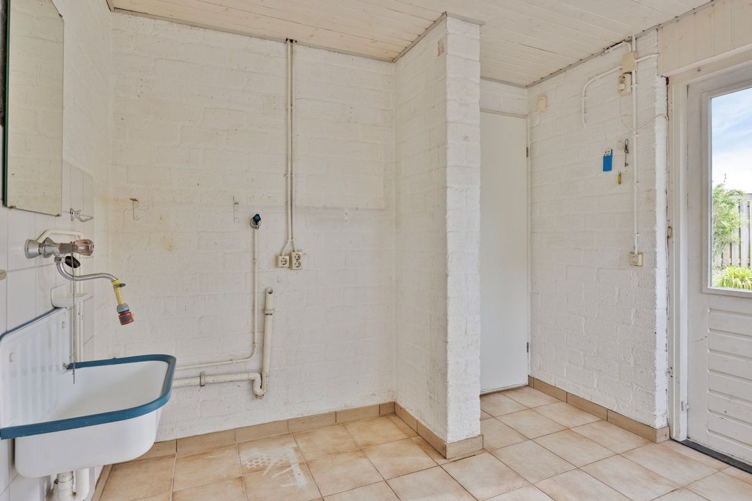 De bijkeuken (ca. 8 m²) is een praktische en multifunctionele ruimte, ideaal als extra bergruimte of provisieruimte. Hier bevindt zich tevens een spoelbak. Vanuit de bijkeuken heeft u eveneens toegang tot de tuin, waardoor deze ruimte een praktische schakel vormt tussen binnen en buiten.