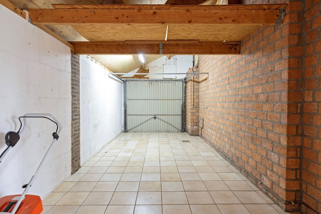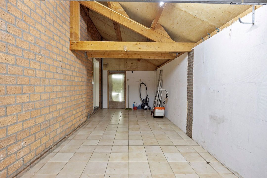 Aan de zijkant van de woning bevindt zich een ruime garage van circa 21 m². De garage is toegankelijk via een handmatig bedienbare kantelpoort en een deur vanuit de tuin. De ruimte is volledig betegeld en voorzien van elektra. Hierdoor is de garage geschikt voor het parkeren van een auto, het stallen van fietsen of het opslaan van gereedschap en overige spullen.