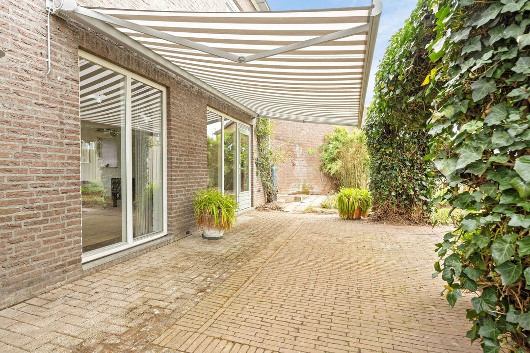 Direct grenzend aan de woonkamer bevindt zich een royaal terras met een uitschuifbaar zonnescherm, waar u heerlijk beschut kunt zitten. Een bijzonder pluspunt is de aanwezige moestuin met kas van circa 8 m², ideaal voor liefhebbers van tuinieren en het buitenleven.