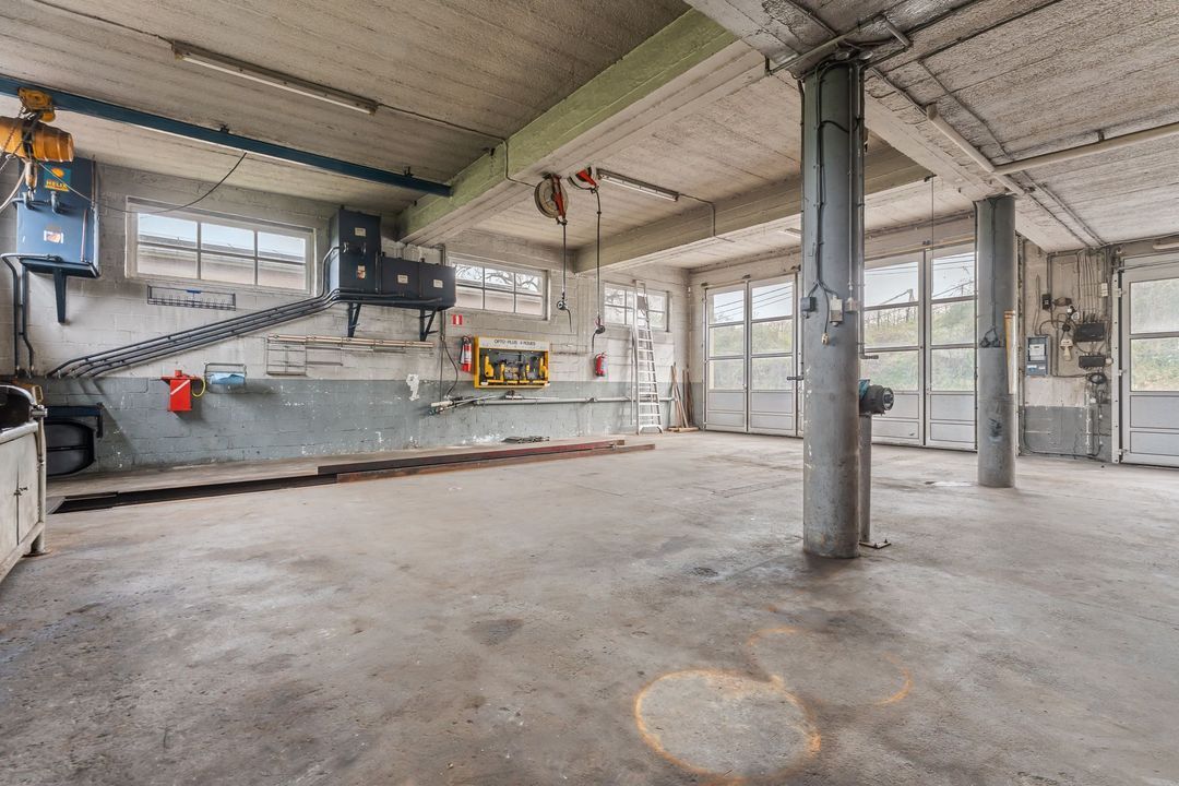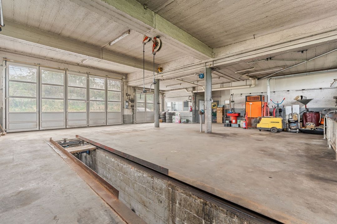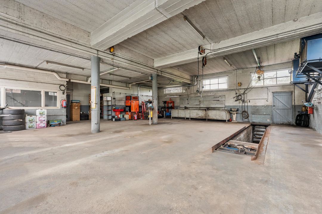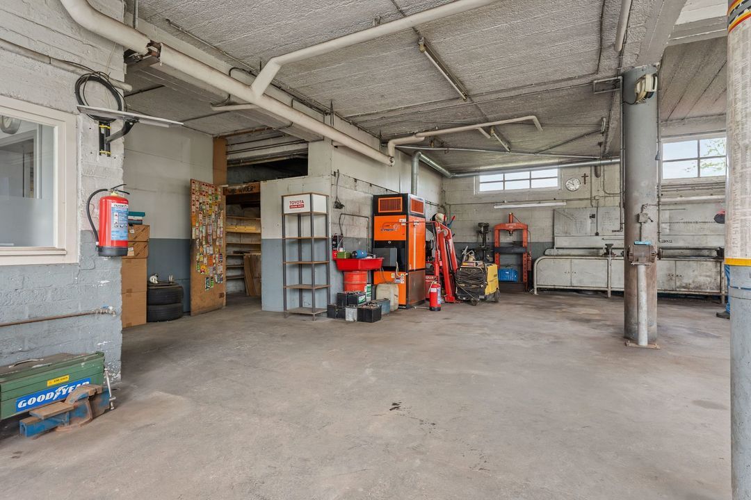 De inkomhal geeft toegang tot een bureelruimte van 8 m². Aansluitend bevindt zich de voormalige garage/werkplaats van 162 m², uitgerust met een smeerput en een grote poort (H: 3,85 m – B: 3,50 m) die volledig geopend kan worden. Daarnaast is er een stockageruimte van 29,20 m², opgedeeld in twee aparte ruimtes. De garage wordt verwarmd via een centrale luchtverwarmer op mazout.