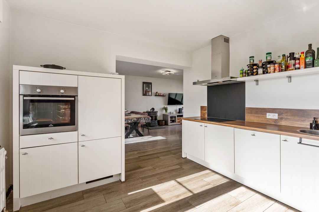 Aansluitend bevindt zich de hedendaagse open keuken (ca. 11,9 m²), volledig uitgerust met alle comfort, waaronder een inductiekookplaat, afzuigkap, oven, vaatwasser en inbouwkoelkast. Vanuit de keuken geniet u van een prachtig uitzicht over het omliggende landschap.
